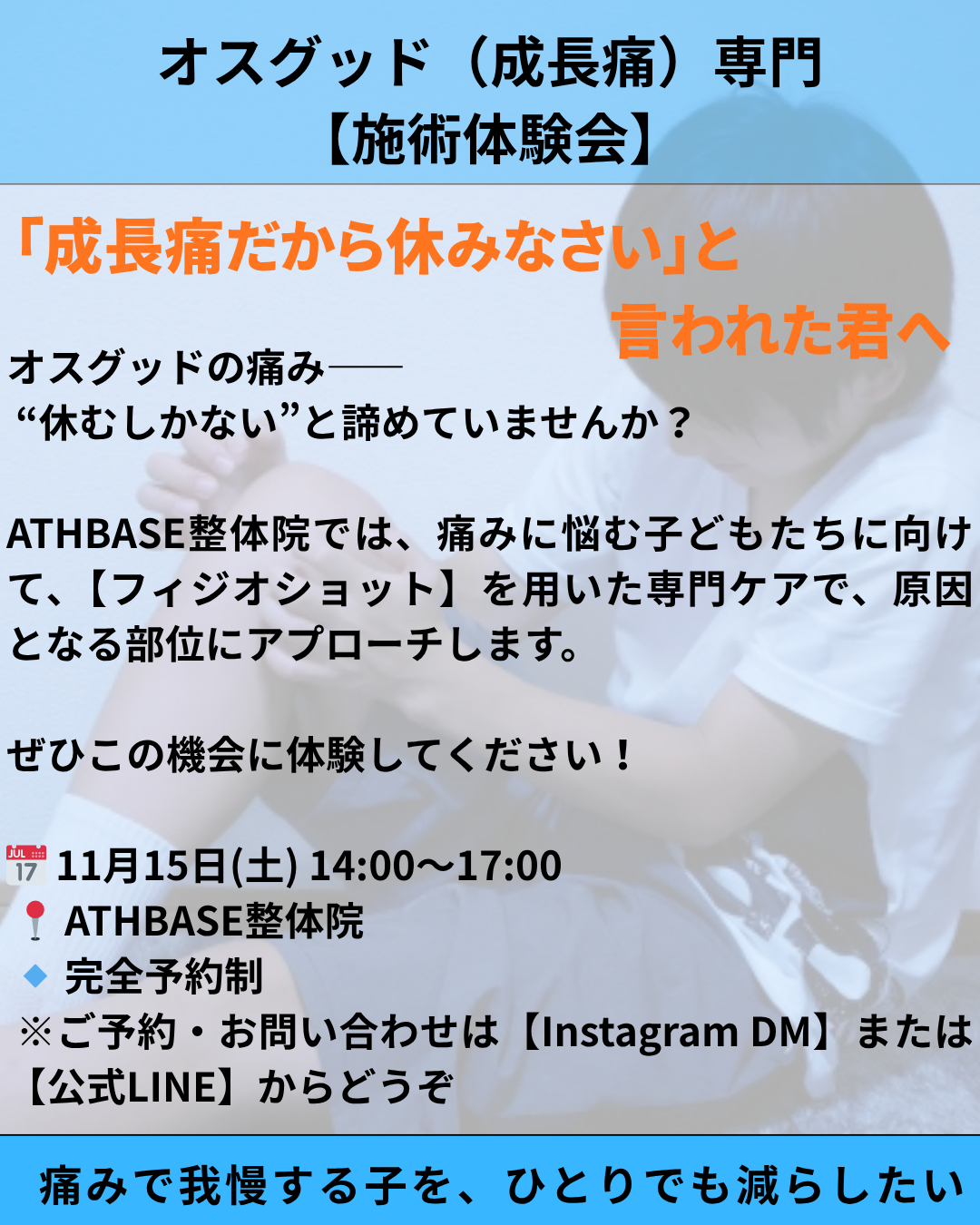 そんな“成長期の膝の痛み(オスグッド)”に特化した施術体験会を開催します。