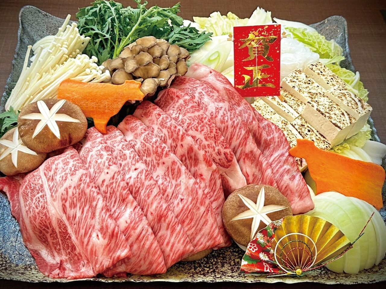 ■黒毛和牛霜降りすき焼きセット(A5ランク黒毛和牛霜降り肩ロース、野菜盛、特製割下、うどん)
