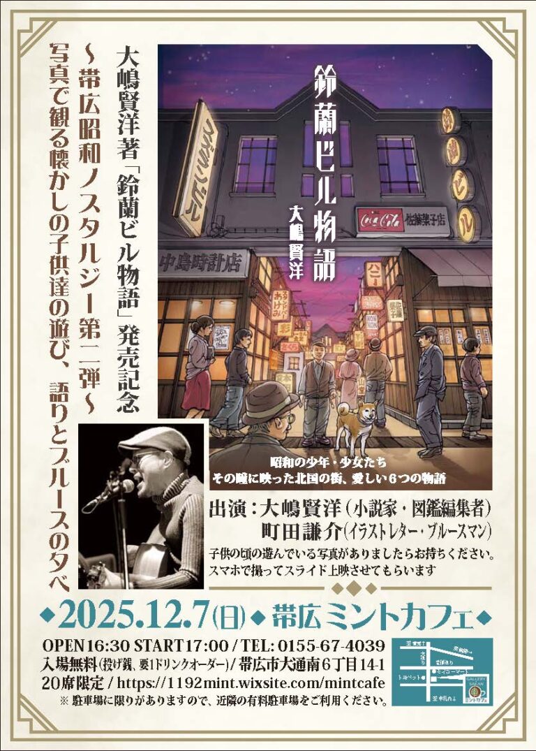 12月7日(日)、帯広ミントカフェにて「帯広昭和ノスタルジー第二弾」が開催されます。今回は、大嶋賢洋さんの著書『鈴蘭ビル物語』の発売を記念した特別なイベント。 -