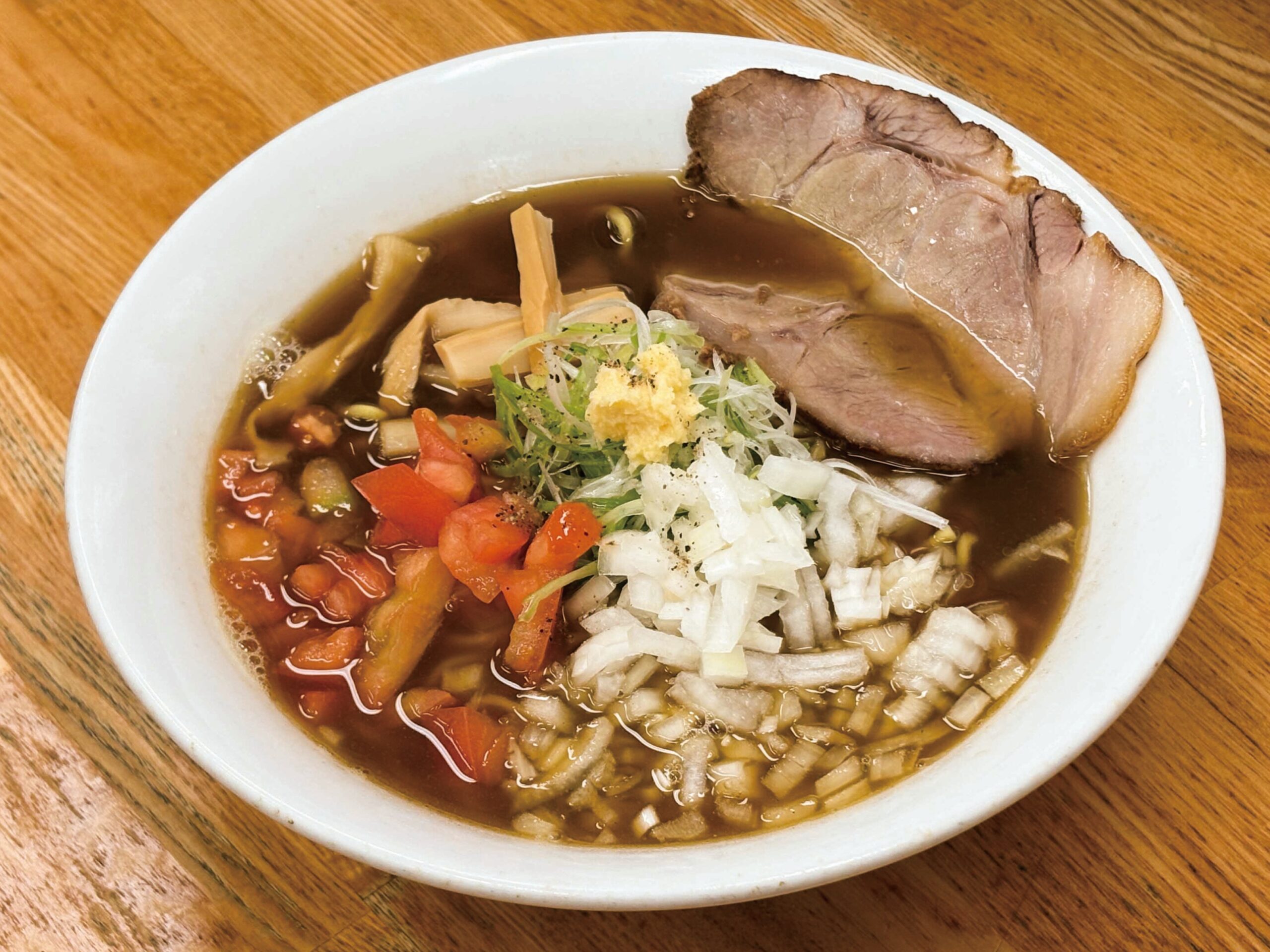 豚骨や魚介などの厳選した食材を10時間かけて煮込んだ自慢のスープに、煮干しの旨味をブレンド。深みとコクのある味わいとトマトの爽やかな酸味が絶妙。店主の妙技が感じられる一杯です。