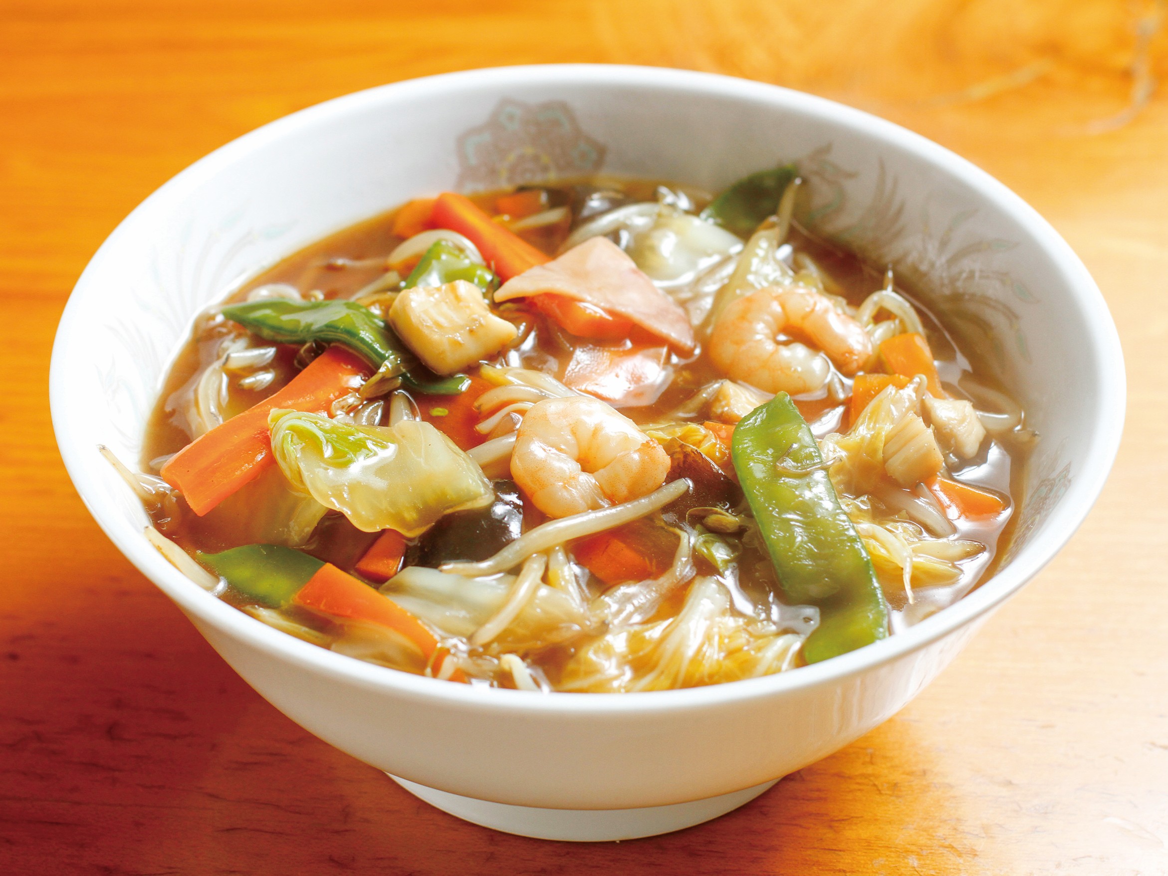 醤油五目をベースに具材にとろみをつけた「あんかけラーメン」。野菜と魚介の旨みが広がるスープに、モチモチ麺がよく絡みます。飽きのこない味わいで、リピーターの多い一品です。