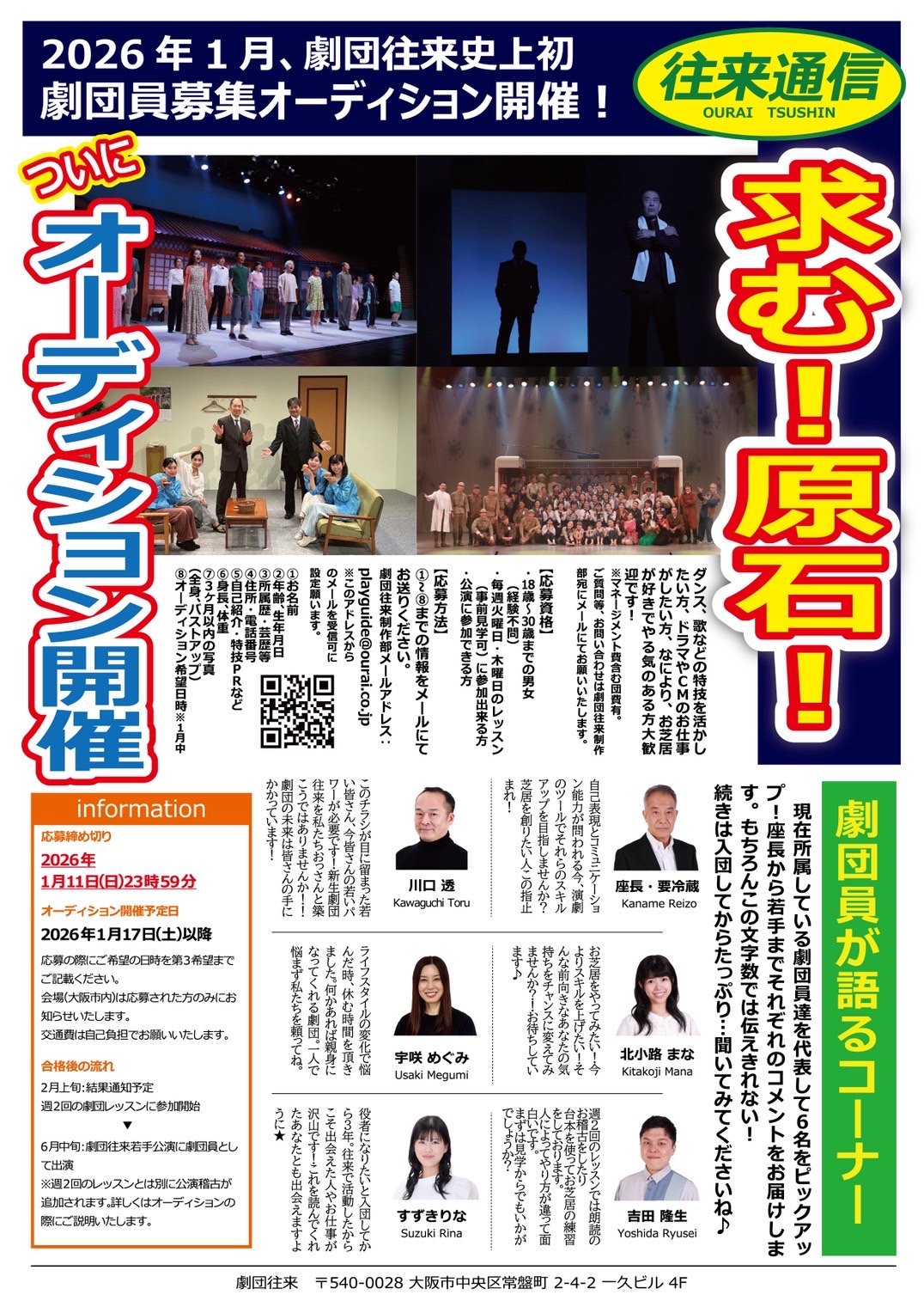 ダンス、歌などの特技を活かしたい方、ドラマやCMのお仕事がしたい方、なによりお芝居が好きでやる気のある方大歓迎です!