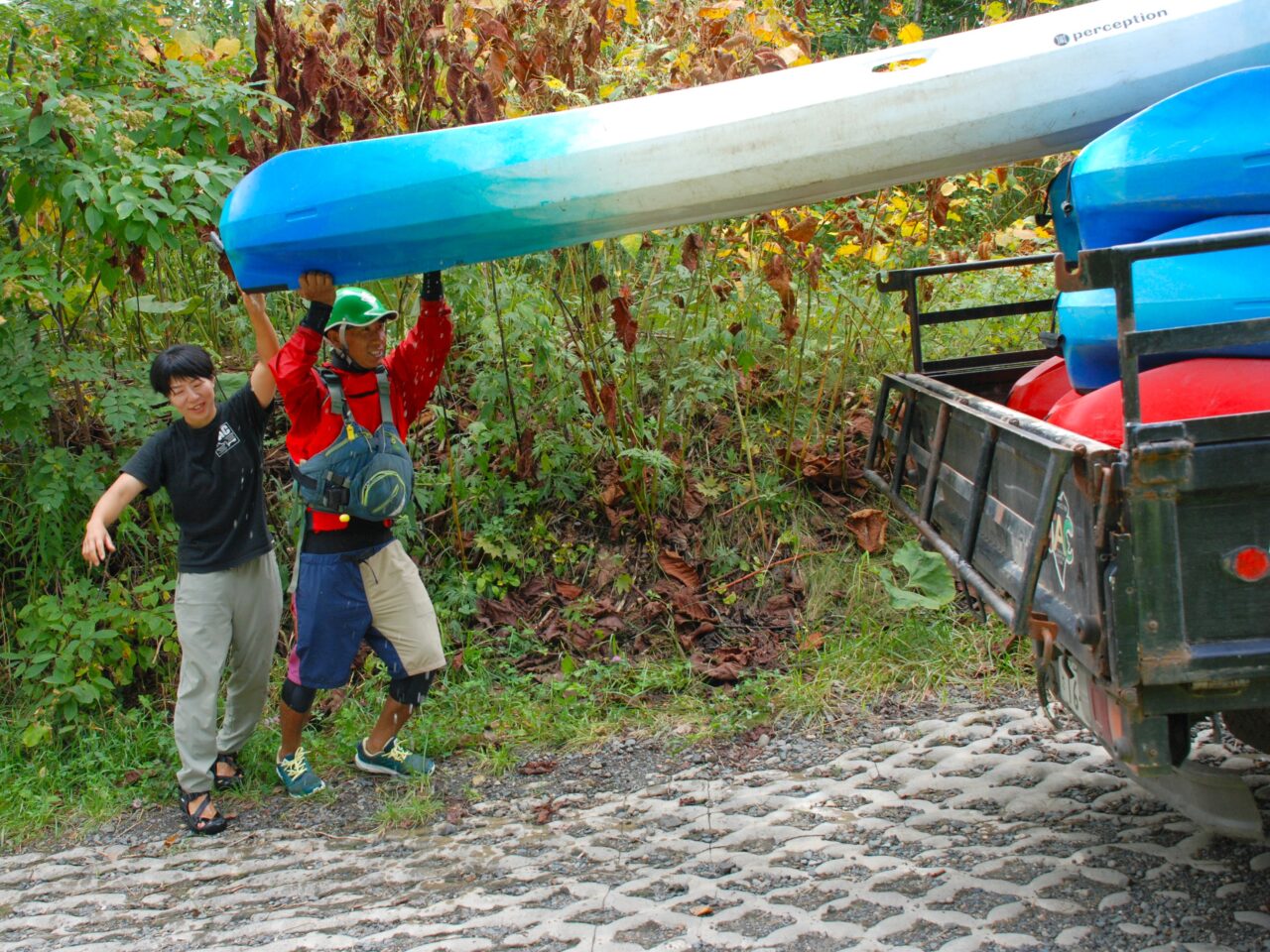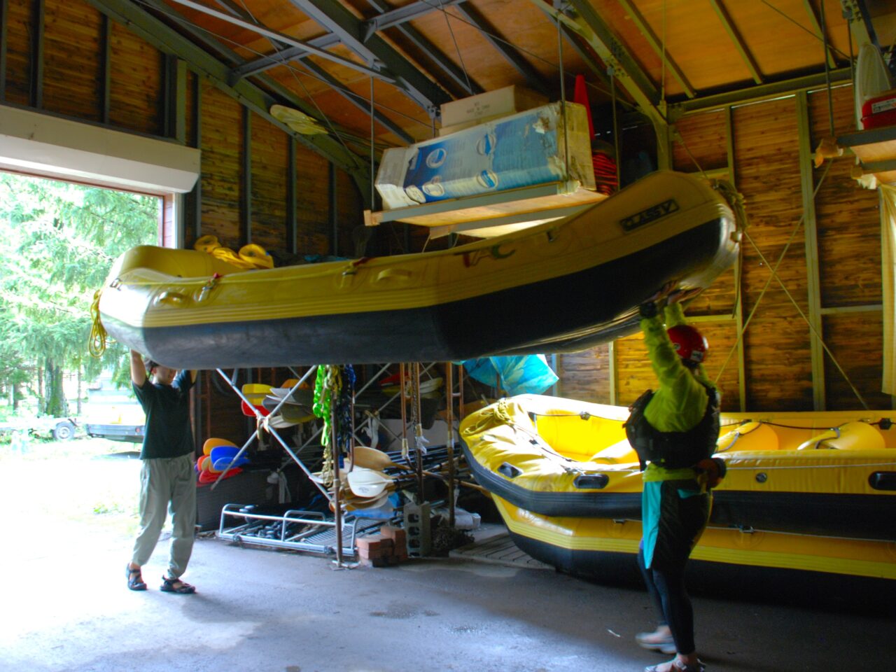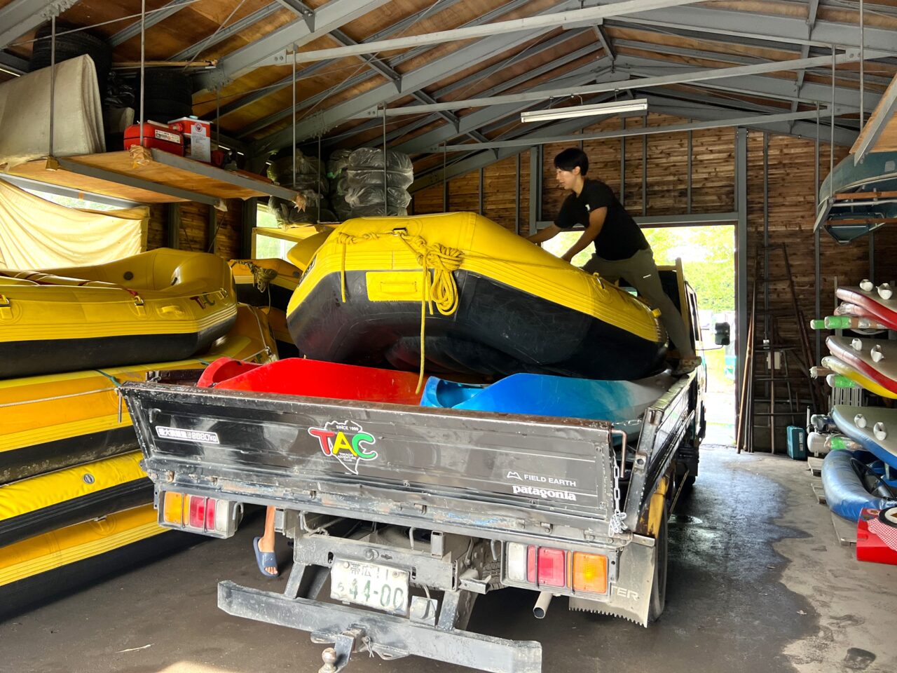 午前のラフティングツアー参加者が到着するまでに準備を完了させます。まずは運搬トラックに必要数のラフティングボートやカヌーを積み込みます。多いときは1台のトラックに4艘のラフティングボートが積み込まれるのだとか。驚きです。