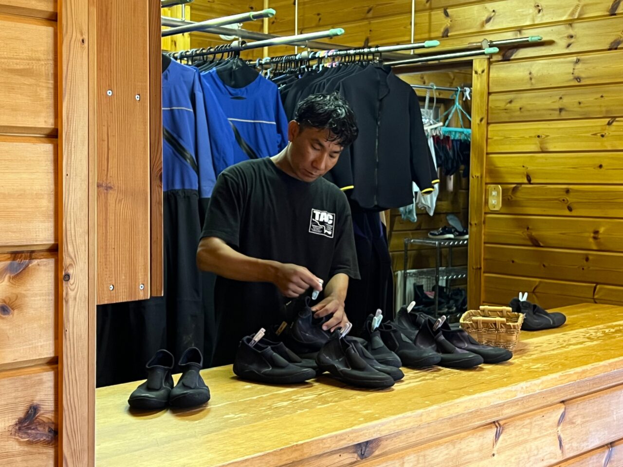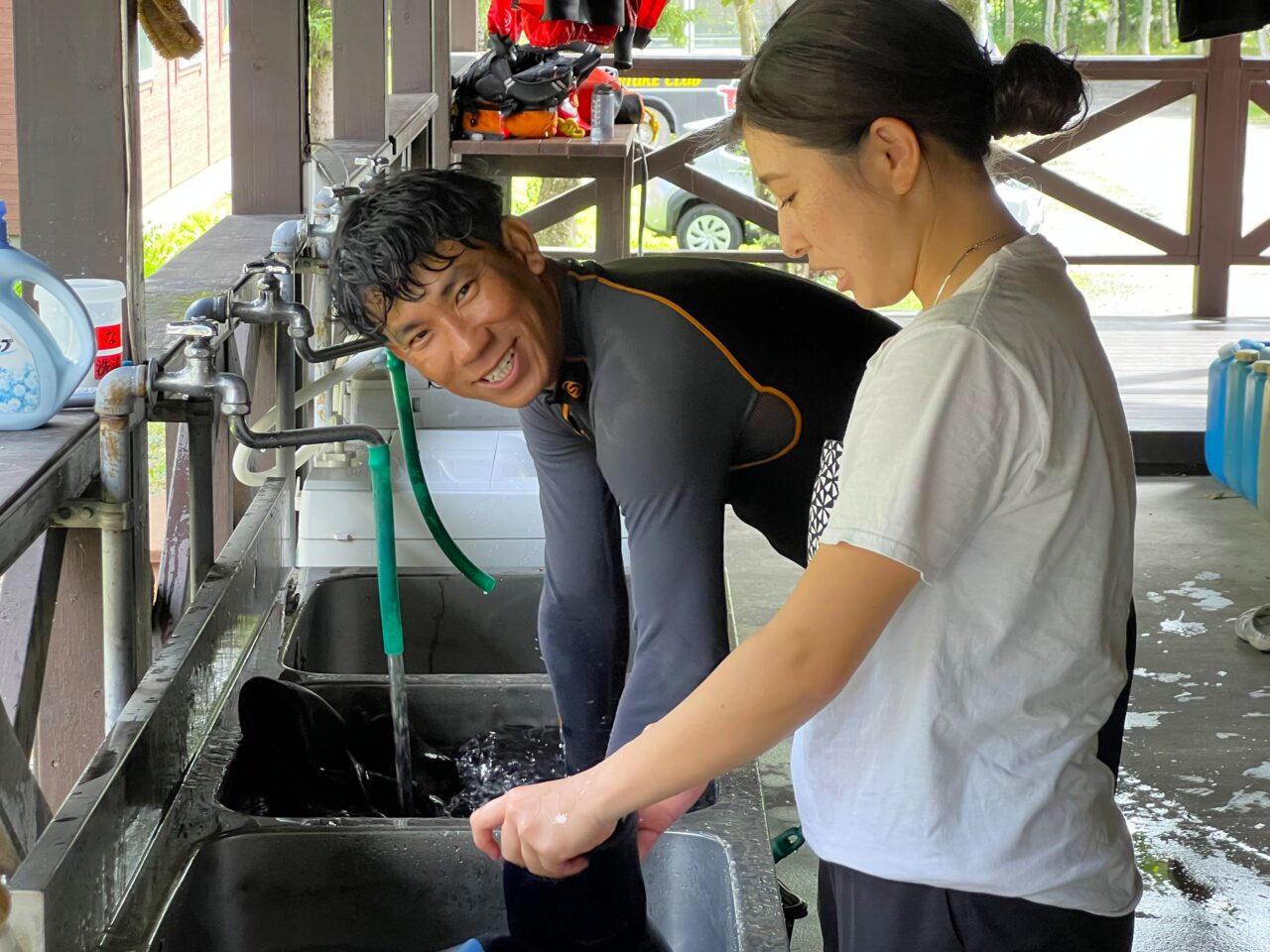 午後のツアースタートは14時。それまでの時間、ウェットスーツの劣化を防ぐ手入れや午後のツアーに必要な備品の準備などを行います。