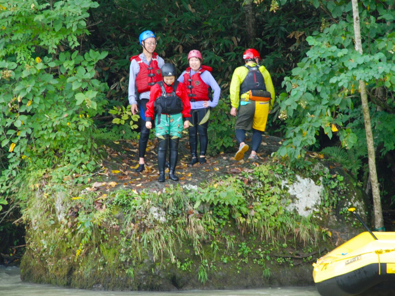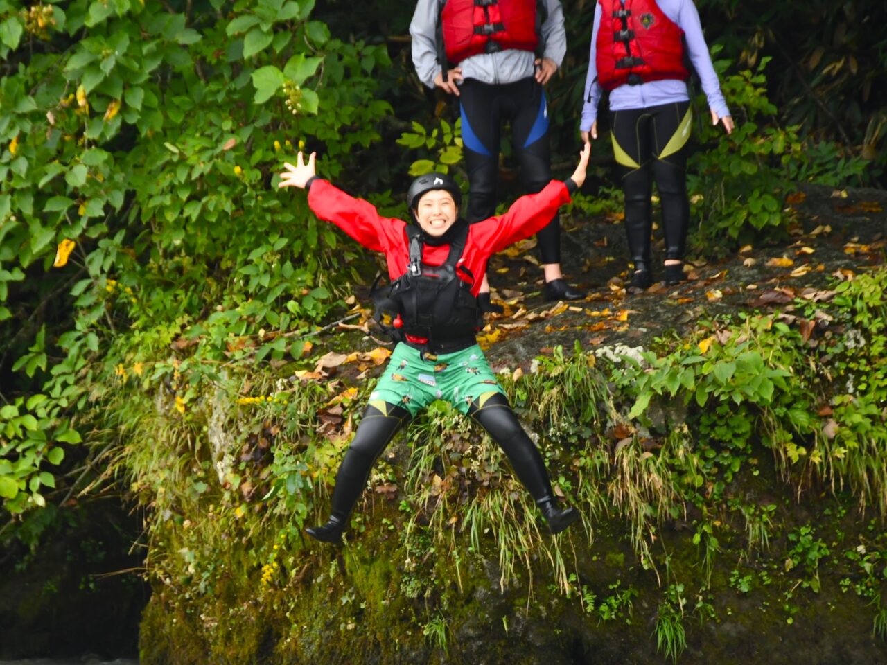 TACのツアーはラフティングやカヌーで川下りするだけではありません。岩場に登って天然の飛び込み台から川にダイブ!童心に返って水遊びを楽しみ尽くします。吉田さんもいざダイブ!
