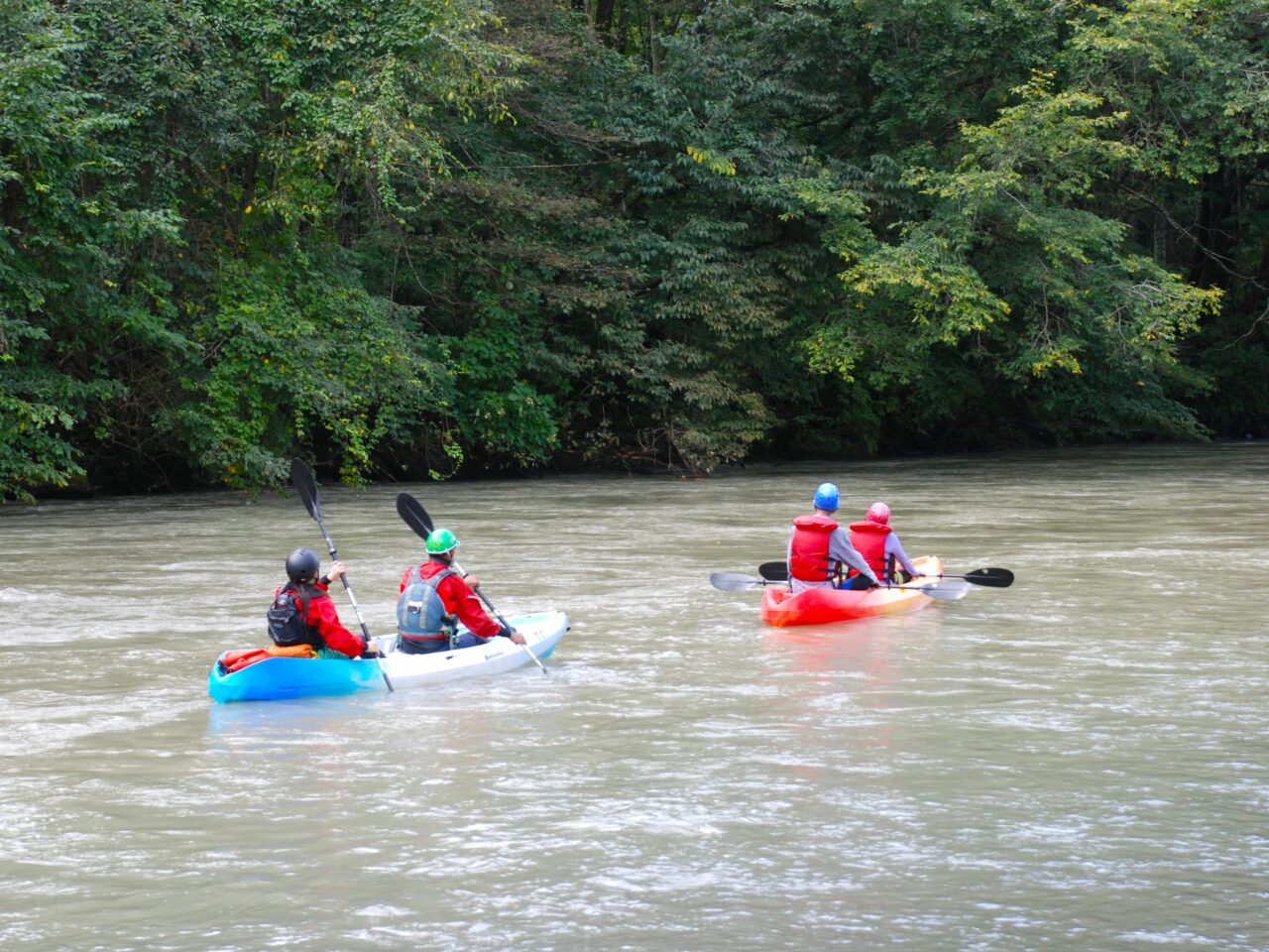 途中でラフティングからカヌーに乗り換えます。ここからはゆったりとした川の流れを感じながら屈足湖へ。参加者とガイドがカヌーで漕ぎ出した裏で、スタッフはラフティングボートを回収し一足先に事務所に戻って片付けます。