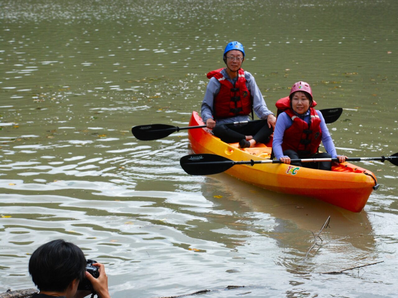 ガイドと一緒に川の上流部に移動します。まずは体験レクチャー。パドルの使い方、万が一水に落ちたときの対処法など、アクティビティを楽しむための重要な情報をお伝えし、軽く練習します。