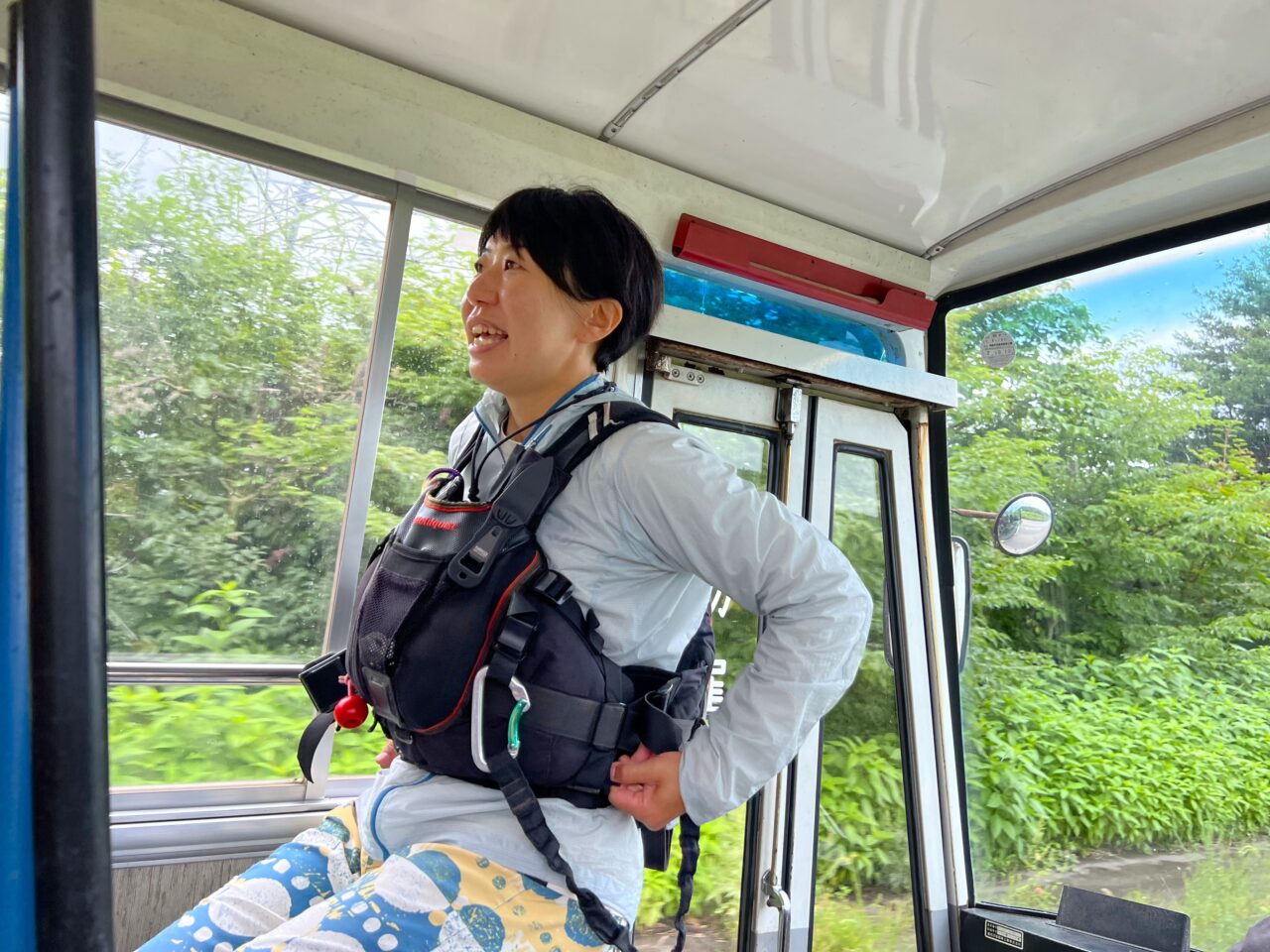 午後はトマムリゾートから参加する複数組の団体ツアー。ボートも3つ出して対応します。ガイドは野村さん、佐野なほ子さん、アソクさんが担当。約20人が一度に川に繰り出すのはなかなか迫力がありました。