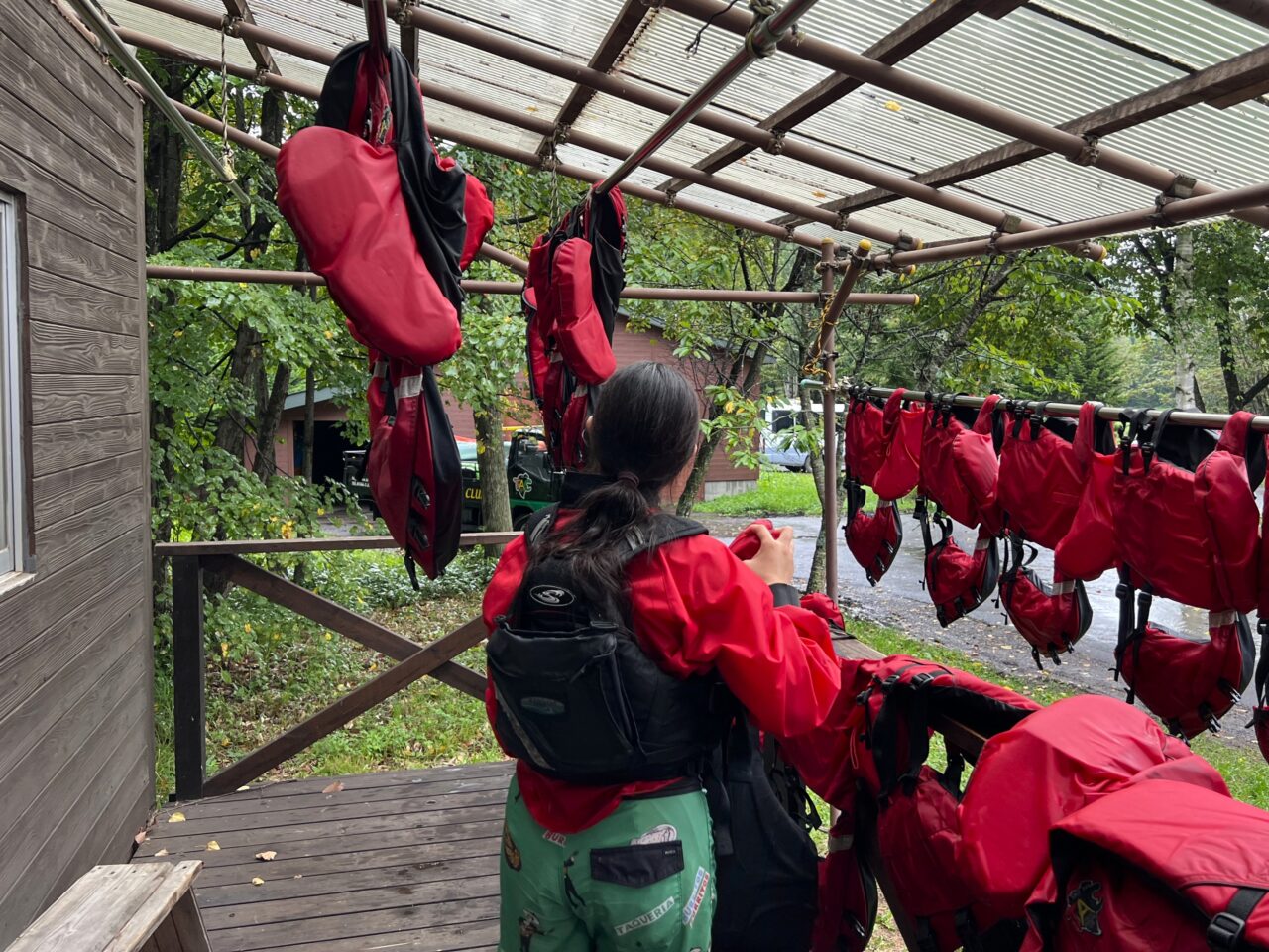9時スタートの午前のツアー。この日はTACで一番人気のラフティング&カヌーのツアーに一組のご夫婦が参加されました。まずは体験のオリエンテーション。参加同意書も忘れずにご記入いただきます。その後ラフティングの装備に着替えます。取材は秋の入り口。まだ温かかったので今回はウェットスーツを着用しました。そのほかライフジャケットなど、安全のためにも装着のサポートも行います。