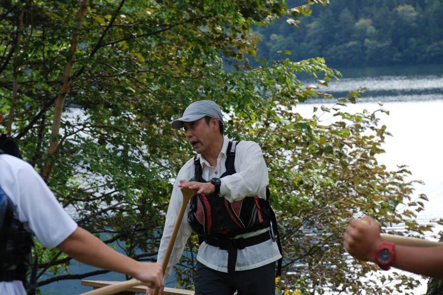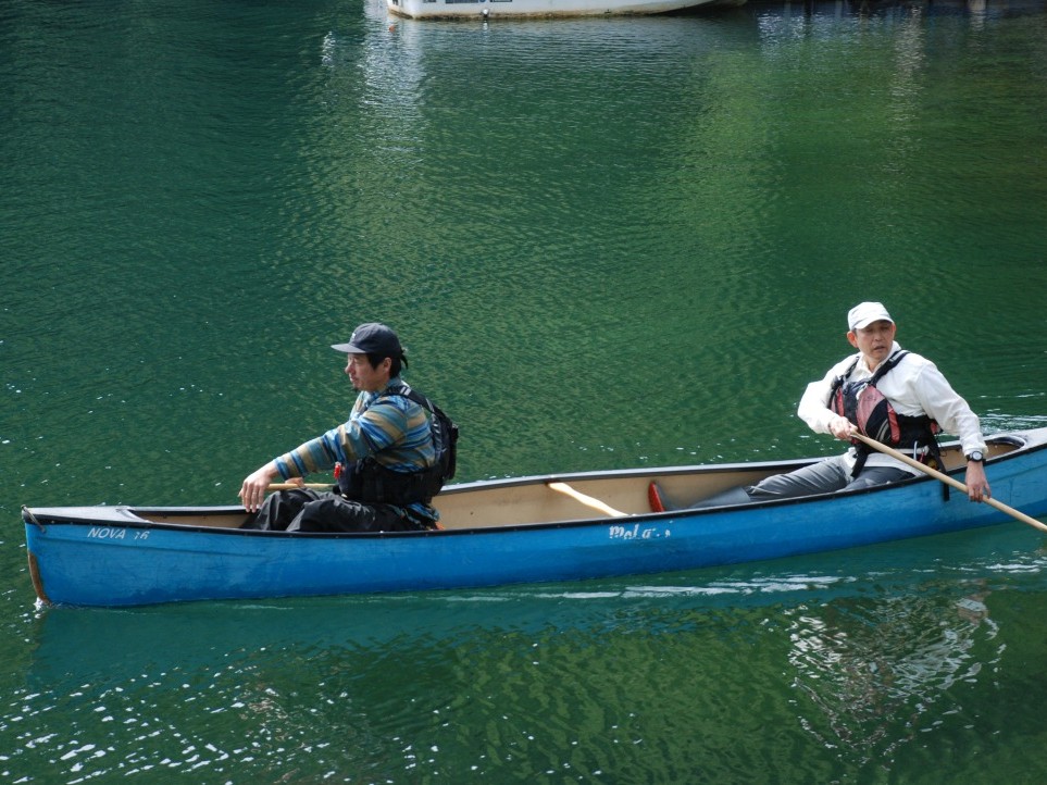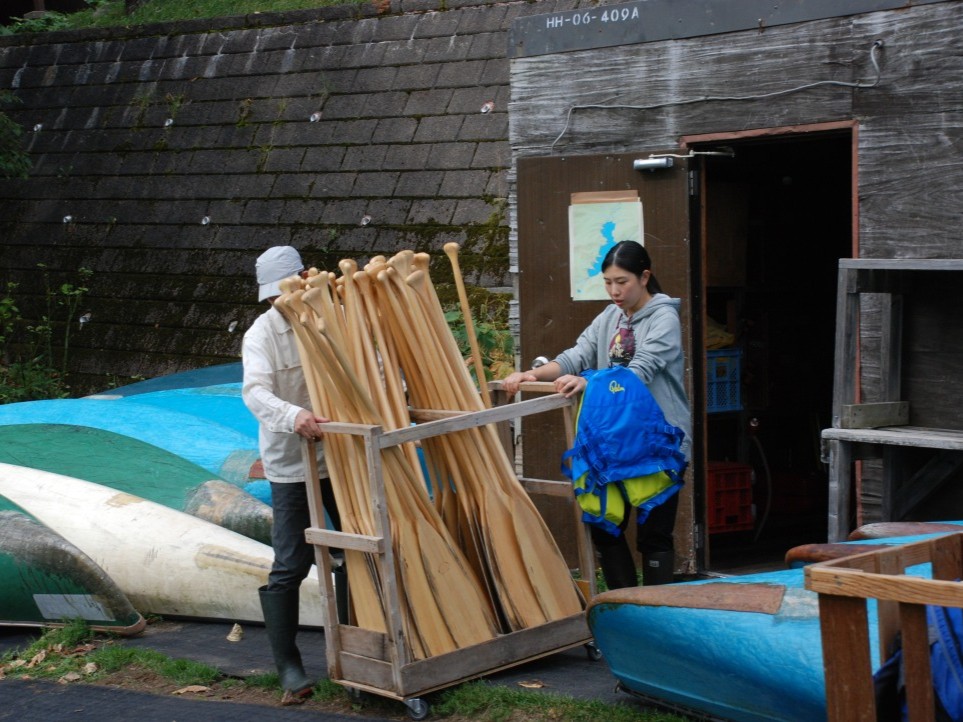 午前は学生20名ほどのカヌーツアー。二人乗りのカナディアンカヌーのチェックやパドルの設置など受け入れの準備を進めます。