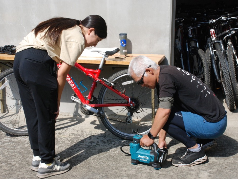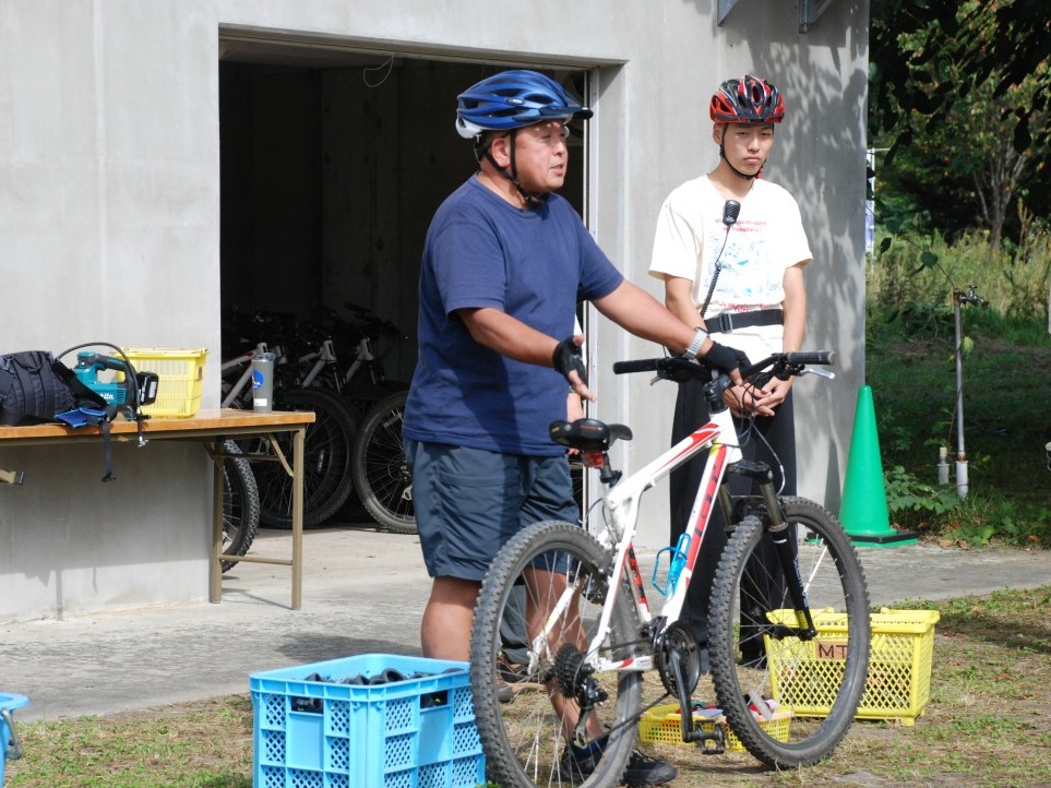 午後のマウンテンバイクツアーの準備をしに、然別湖からツアーの催行場所まで移動します。現地には午後のツアーを担当するガイドさんが、すでに下見などを終えて準備を進めていました。タイヤの空気チェックはもちろん、グローブやヘルメットなど装備品も確認。また20人規模の参加者の場合、実際に走るとかなり長い列になるため、ガイドは先頭、中段、最後尾と配置もそれぞれ。コミュニケーションをとるためにトランシーバーの装着・通信確認も欠かせません。