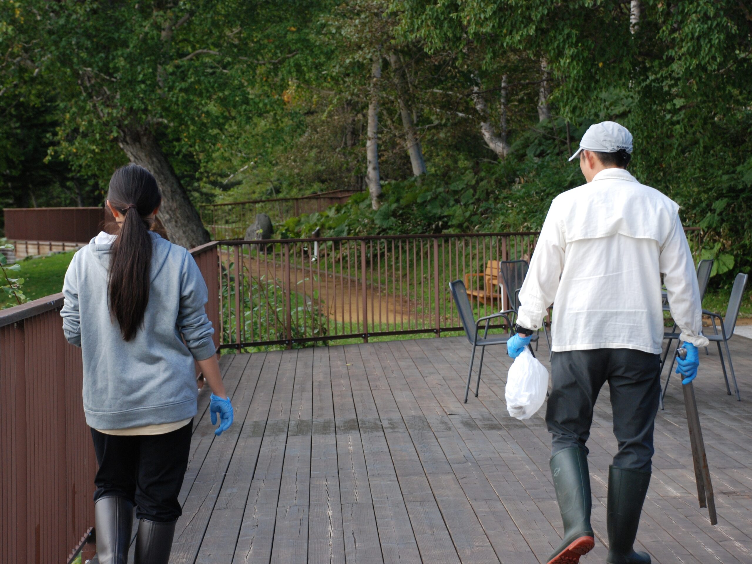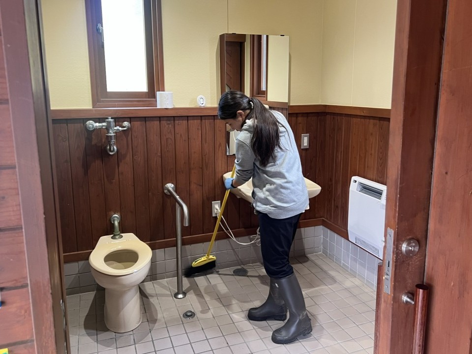 然別湖のほとりの2階建ての建物。1階には然別湖ネイチャーセンター、2階にはフレンチベーグルが人気のcafeムバンチがあります。まずは石川さんと合流し、本日の予定を確認。朝イチの仕事は然別湖の観光トイレの掃除と、周辺のゴミ拾いからスタートです。