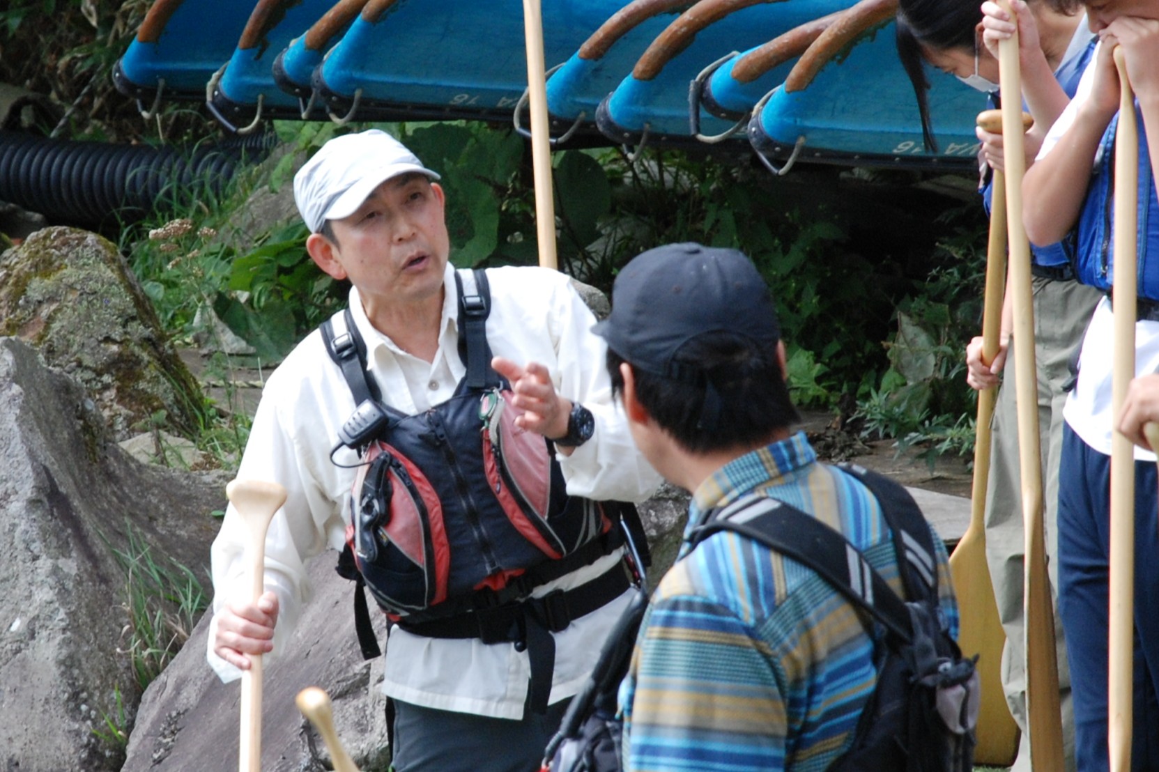 今日ツアーに参加するのは関西から来たという学生たち。ガイドの自己紹介の後は、ライフジャケットの着用を指導。1人1つパドルを持ってもらったら、体験オリエンテーションがスタート。漕ぎ方のコツや、安全のために覚えてほしいことを伝えます。