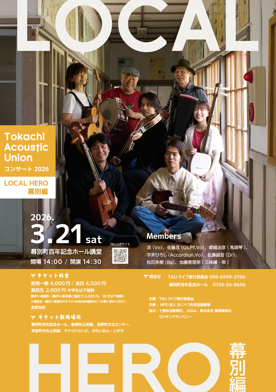 【3/21(土)】とかちアコースティックユニオン コンサート2026 “LOCAL HERO”幕別編 投稿日 2026年1月14日 著者 荒 カテゴリー 十勝・帯広のイベント 【出演】流(歌)、佐藤亙(ギター、ピアノ)、嵯峨治彦(馬頭琴)ほか 【日時】2026年3月21日(土)開場 14:00開演 14:30 【場所】幕別町百年記念ホール 講堂 【料金】前売り4,000円(当日4,500円)高校生2,000円(当日受付)中学生以下無料 【チケット取扱い所】幕別町百年記念ホール、チケットらいぶ、音更町文化センターほか 【問い合わせ先】TAUライブ実行委員会090-6999-2706