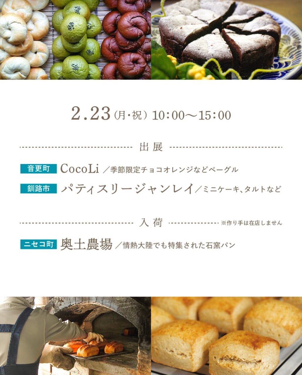 23日(月・祝)には、音更町「CocoLi」のベーグルや、釧路市「パティスリージャンレイ」のミニケーキやタルト、ニセコ町「奥土農場」のパンなど、十勝管内外の美味しいものが勢ぞろいします。