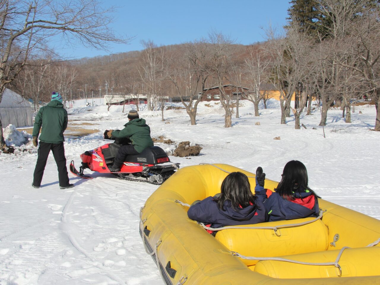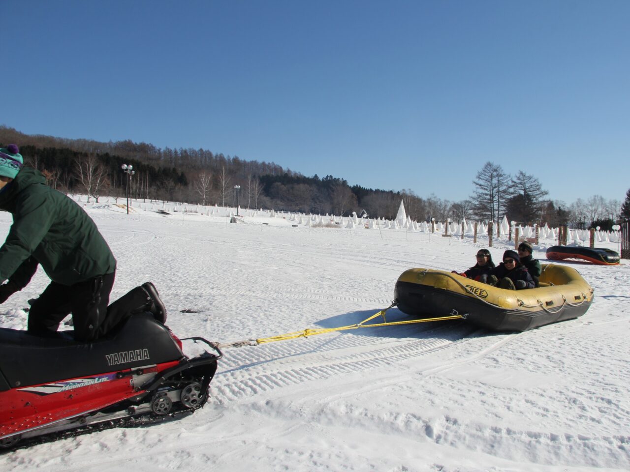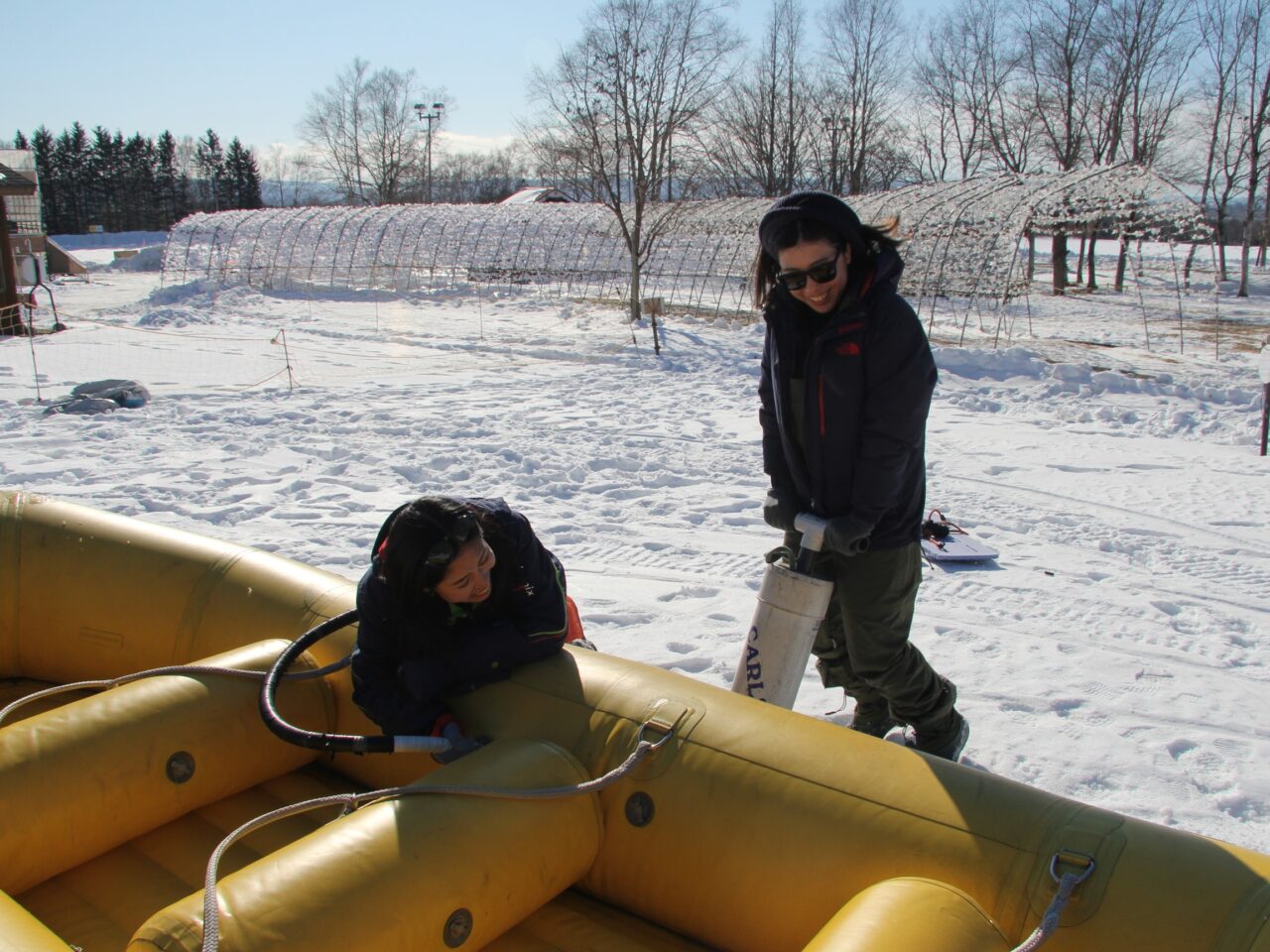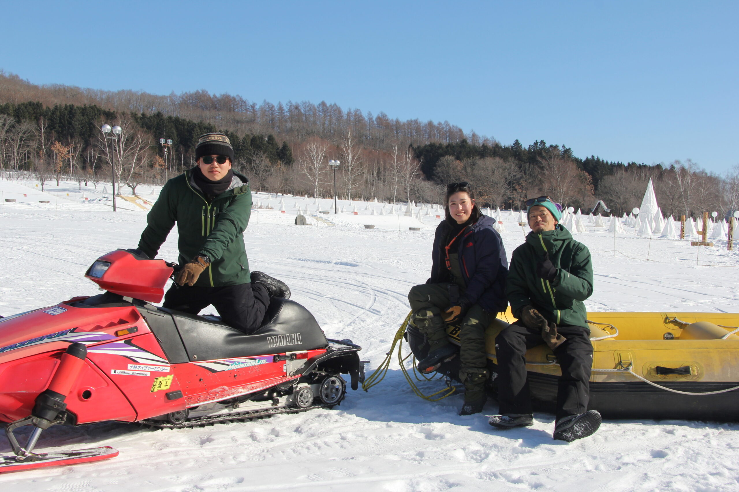 実は取材日は十勝川温泉の冬のイベント「彩凛華」の初日に当たっており、原田さんに「スノーラフティングの練習に少しだけ付き合ってくれませんか」と頼まれた吉田さんは快諾し、ともに会場である十勝ヶ丘公園へ。使用するラフティングボートに空気を入れ、整備完了。スタッフの石坂さんは昨年十勝ネイチャーセンターに合流。彩凛華のスノーラフティングを今年担当するということで、コースの下見や実際のスノーモービルの運転について原田さんから指導を受けていました。