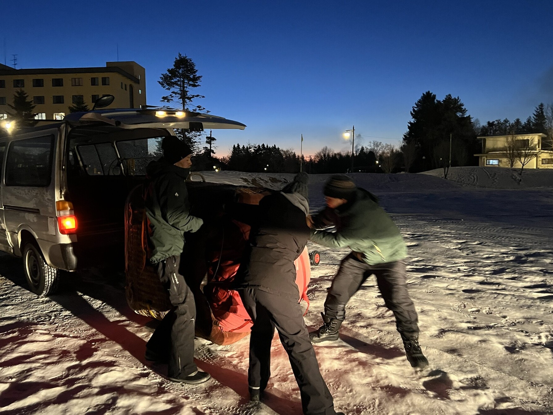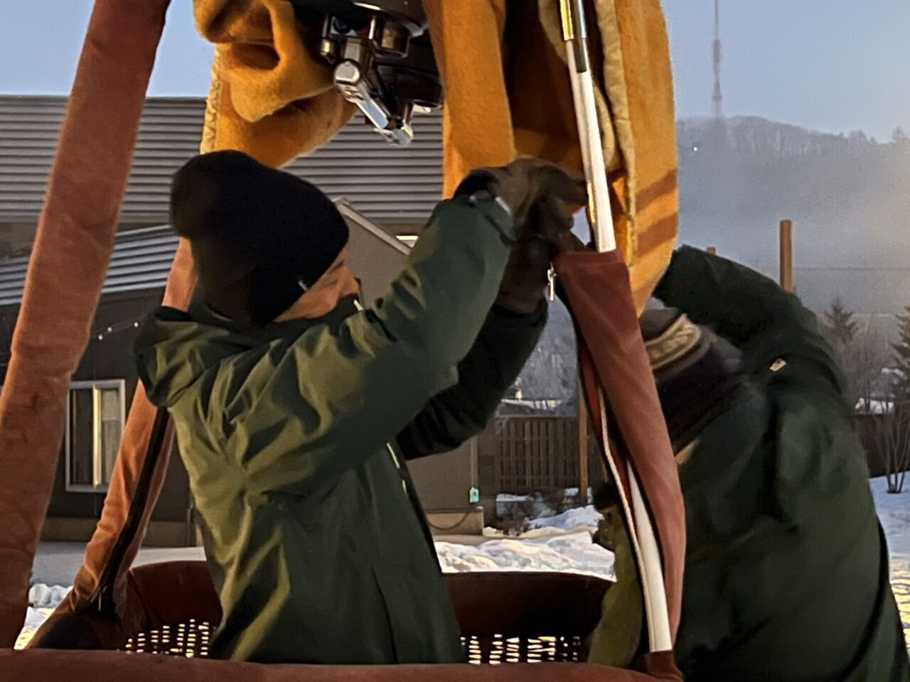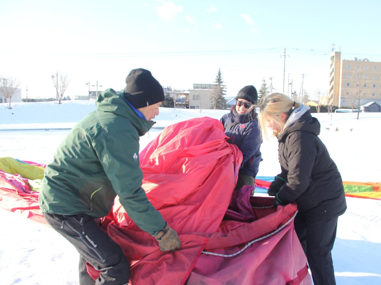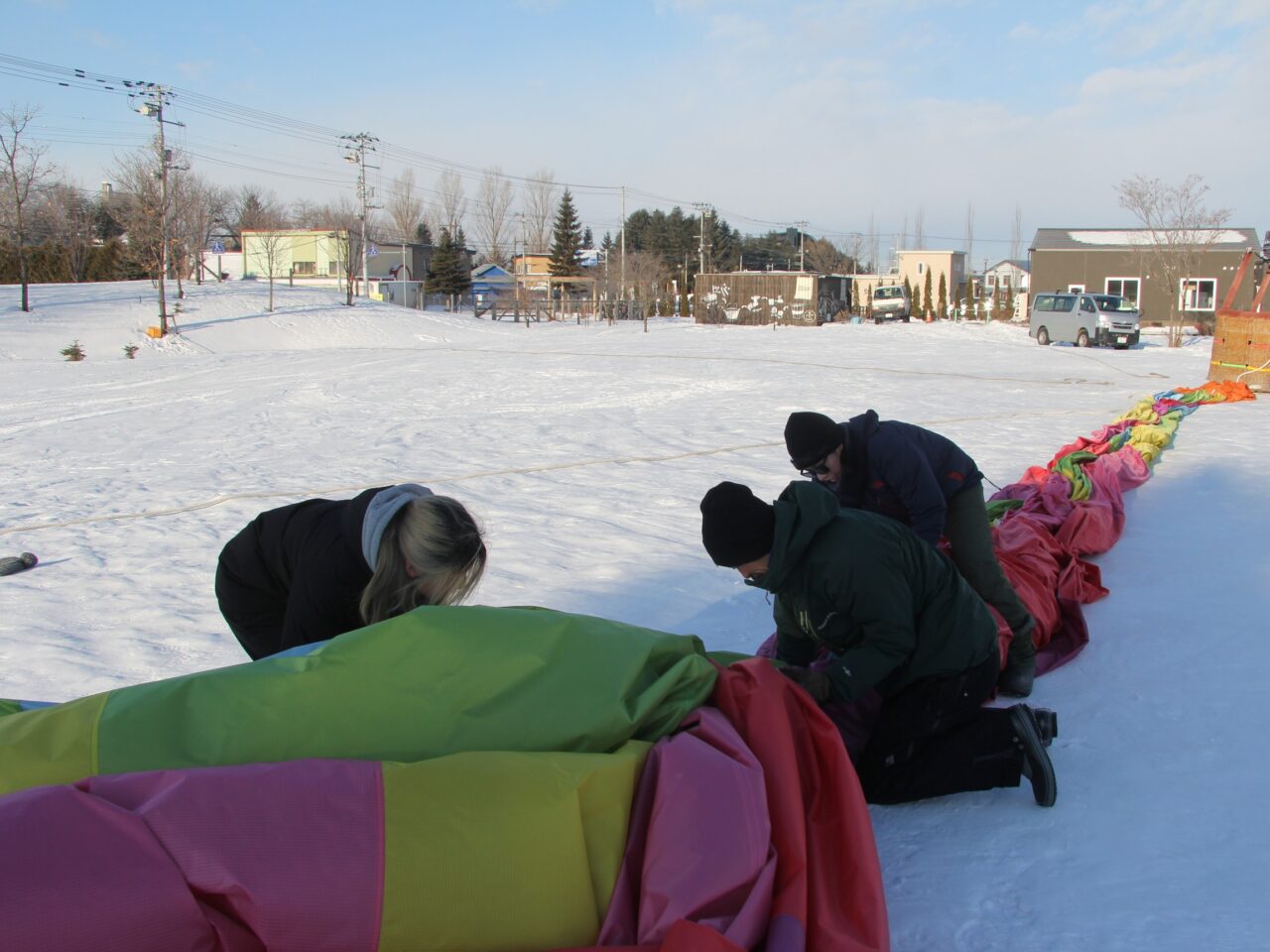 この日の集合時間は早朝6時。日が昇る前から動き出すのは、早朝の熱気球体験に団体予約が入ったため。十勝ネイチャーセンターが提供する熱気球体験は、4~9月までの夏場は予約不要ですが、冬場は団体予約が入った時のみ動かします。この季節、台湾の団体ツアーの参加者が多く、この日はなんと4組もの団体予約が。準備は時間との勝負。荷造り後はすみやかに会場である道の駅ガーデンスパ十勝川温泉に移動し、早速気球を組み立てていきます。
