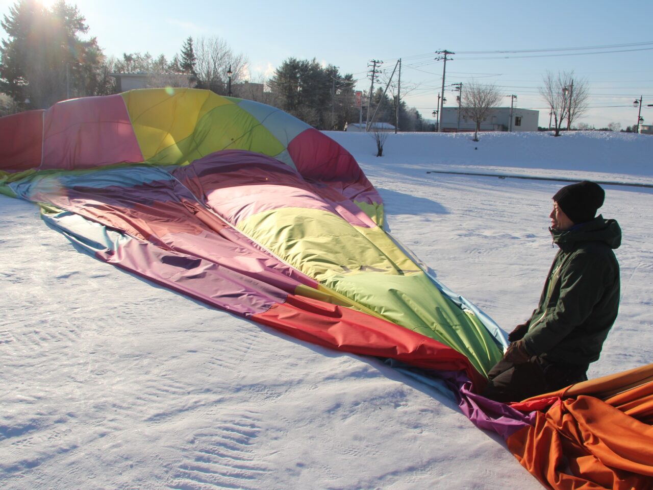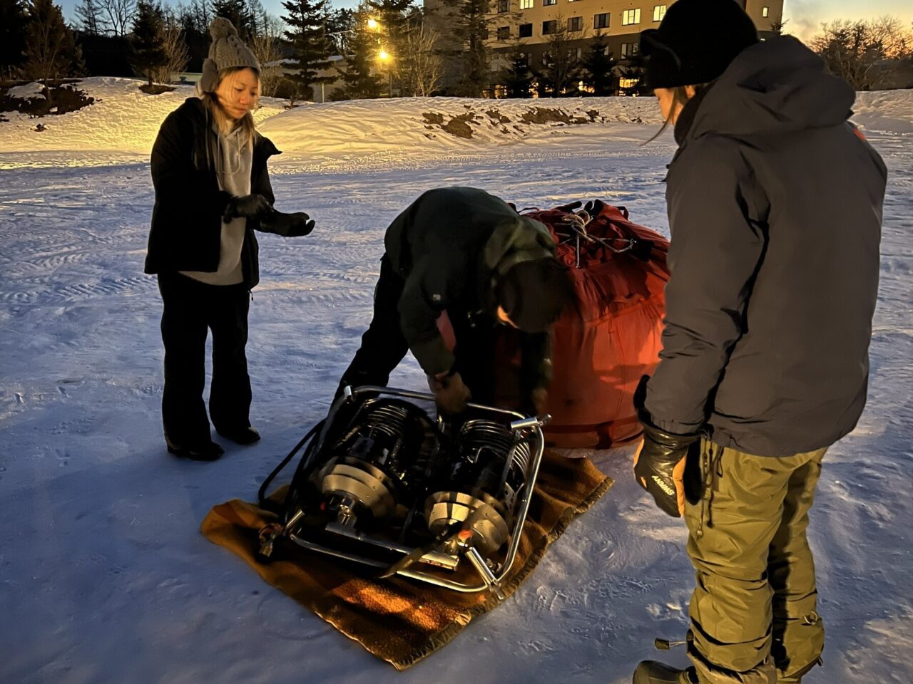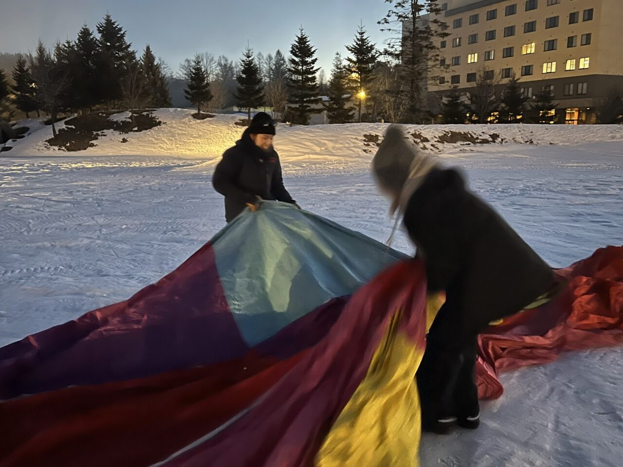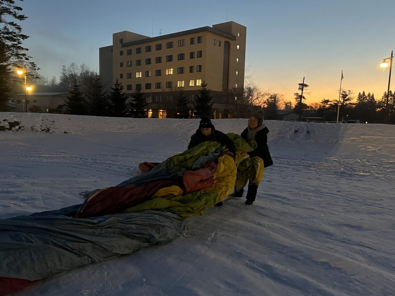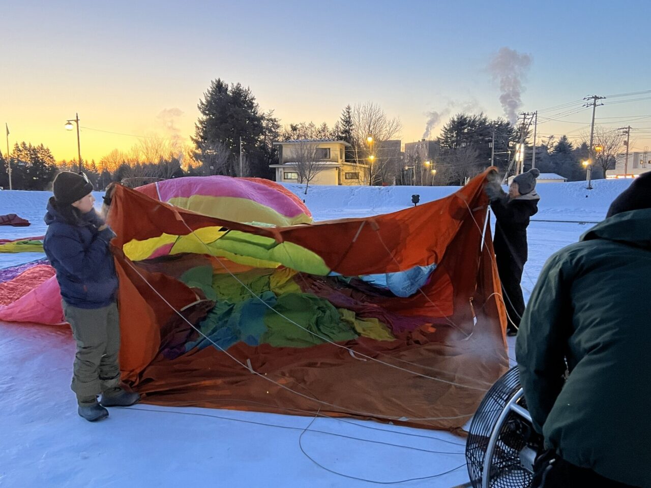 この日の集合時間は早朝6時。日が昇る前から動き出すのは、早朝の熱気球体験に団体予約が入ったため。十勝ネイチャーセンターが提供する熱気球体験は、4~9月までの夏場は予約不要ですが、冬場は団体予約が入った時のみ動かします。この季節、台湾の団体ツアーの参加者が多く、この日はなんと4組もの団体予約が。準備は時間との勝負。荷造り後はすみやかに会場である道の駅ガーデンスパ十勝川温泉に移動し、早速気球を組み立てていきます。