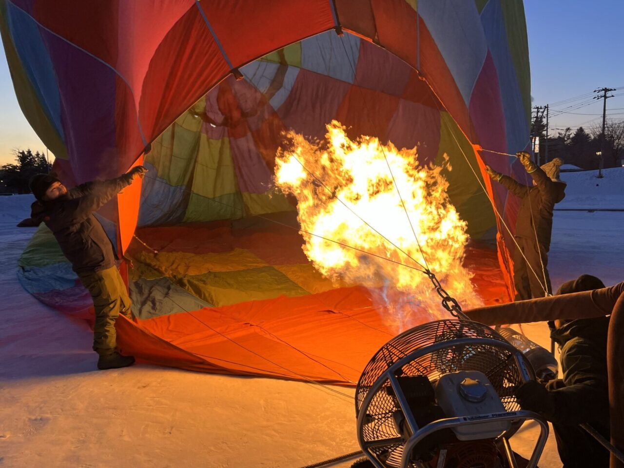 球皮とバスケットを繋いだら、球皮に風を送り込み膨らませていきます。ある程度膨らんだらバーナーから熱を送り込み、浮力を与えます。すると球皮が浮かびあがり、すっかりおなじみの気球の姿へ。