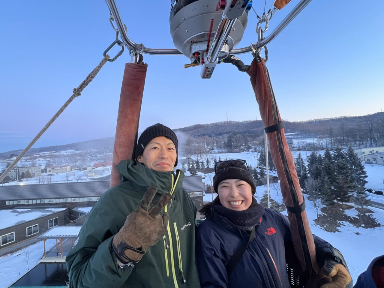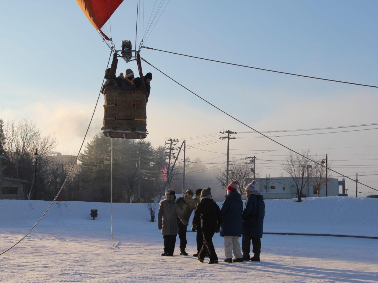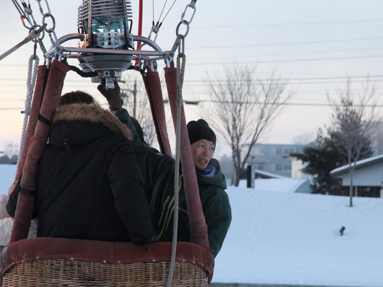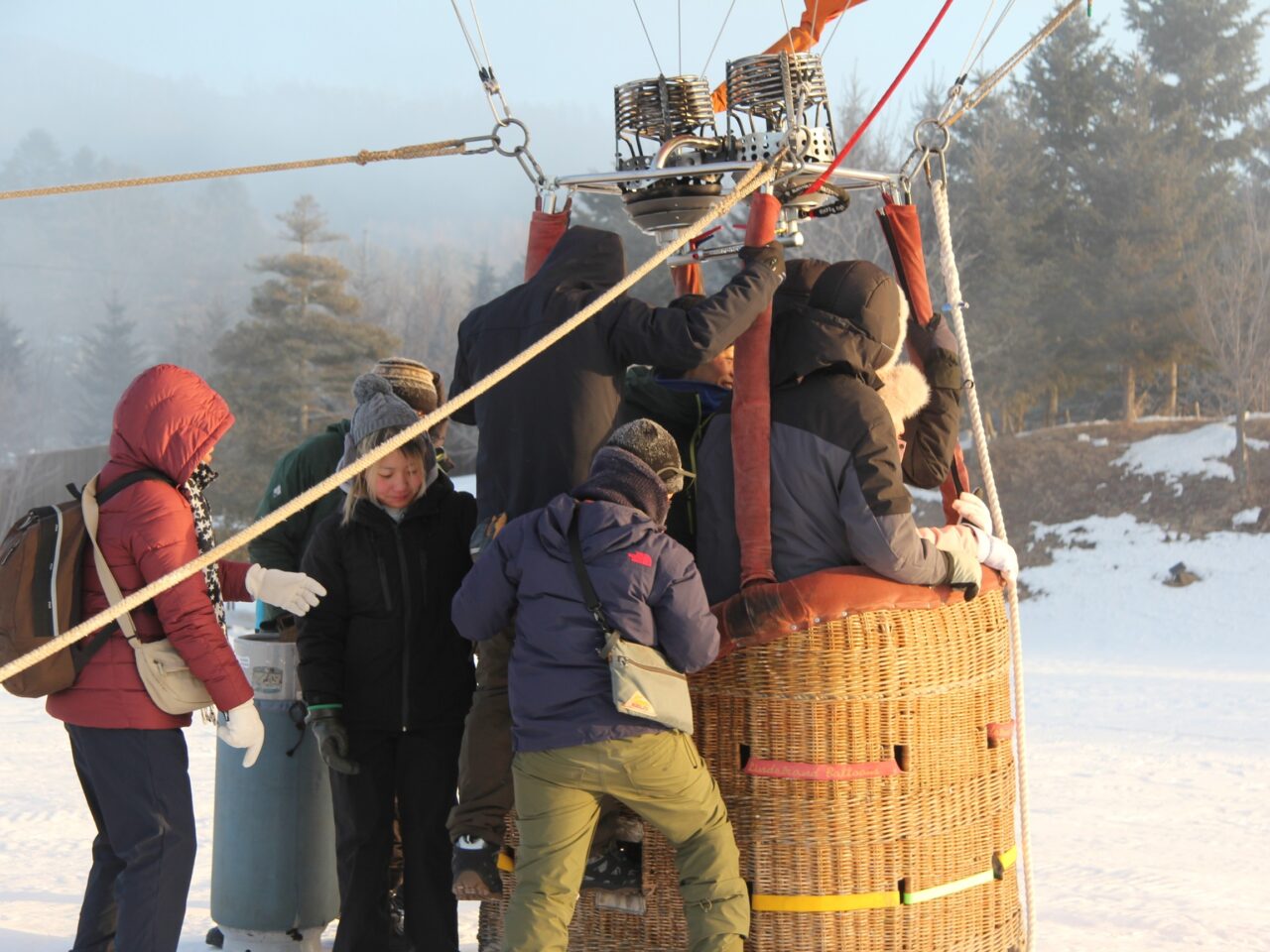 参加者がくるまでに少し時間があったので、原田さんが快く気球に乗せてくれました。係留フライトの場合、高さはおよそ20~30mほど。この日は-20℃まで気温が下がる今シーズン一番ともいえる冷え込み。上空から見る十勝川には川霧が立ち込めていました。