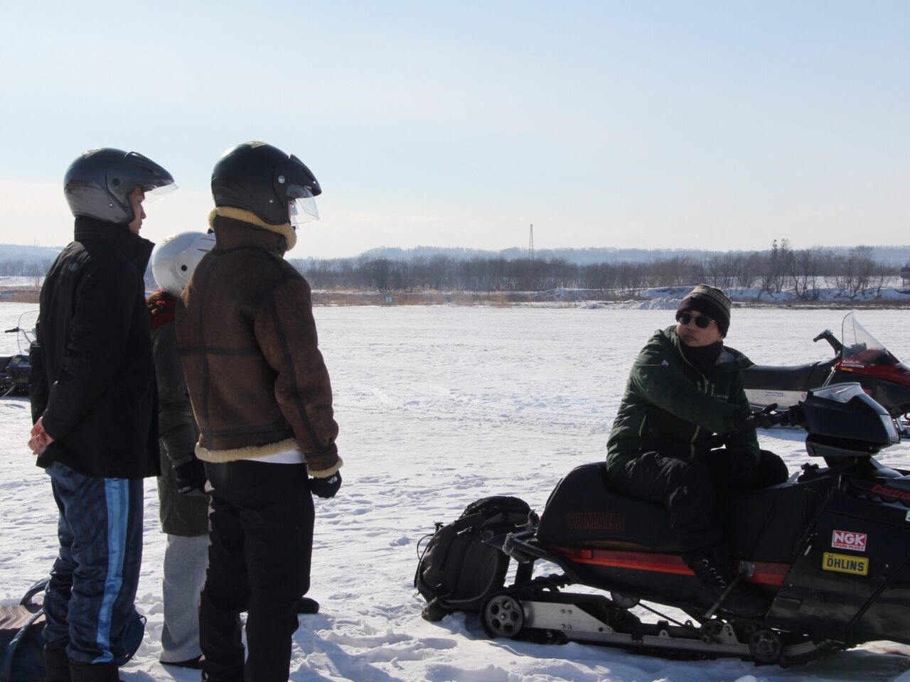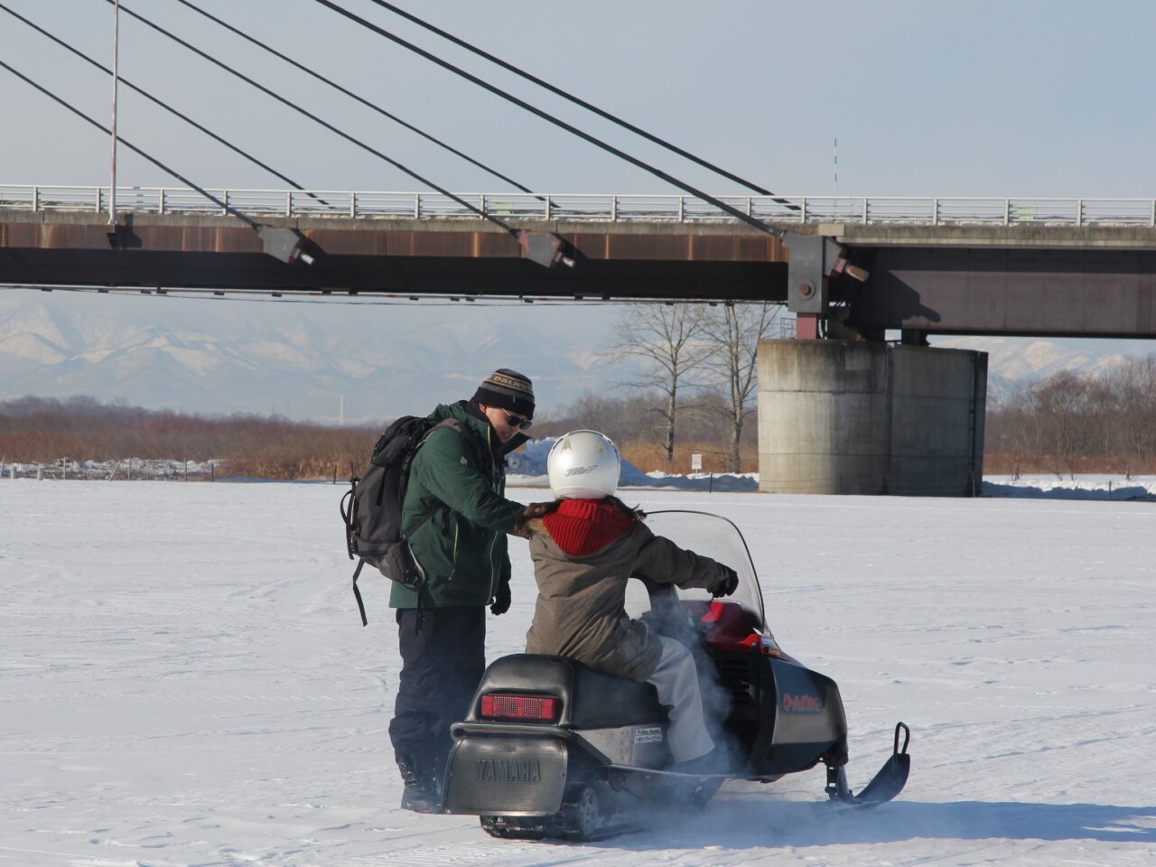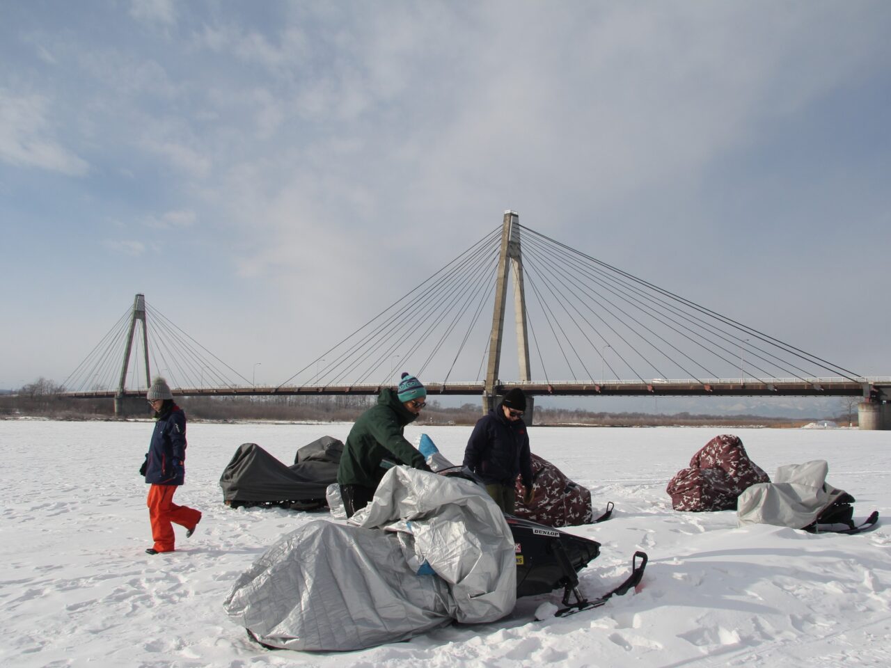 この日の午前中はリバーサイドでのスノーモービルツアーに1組4名で予約が入っていました。スノーモービルの準備に一度十勝川の河川敷へと移動します。