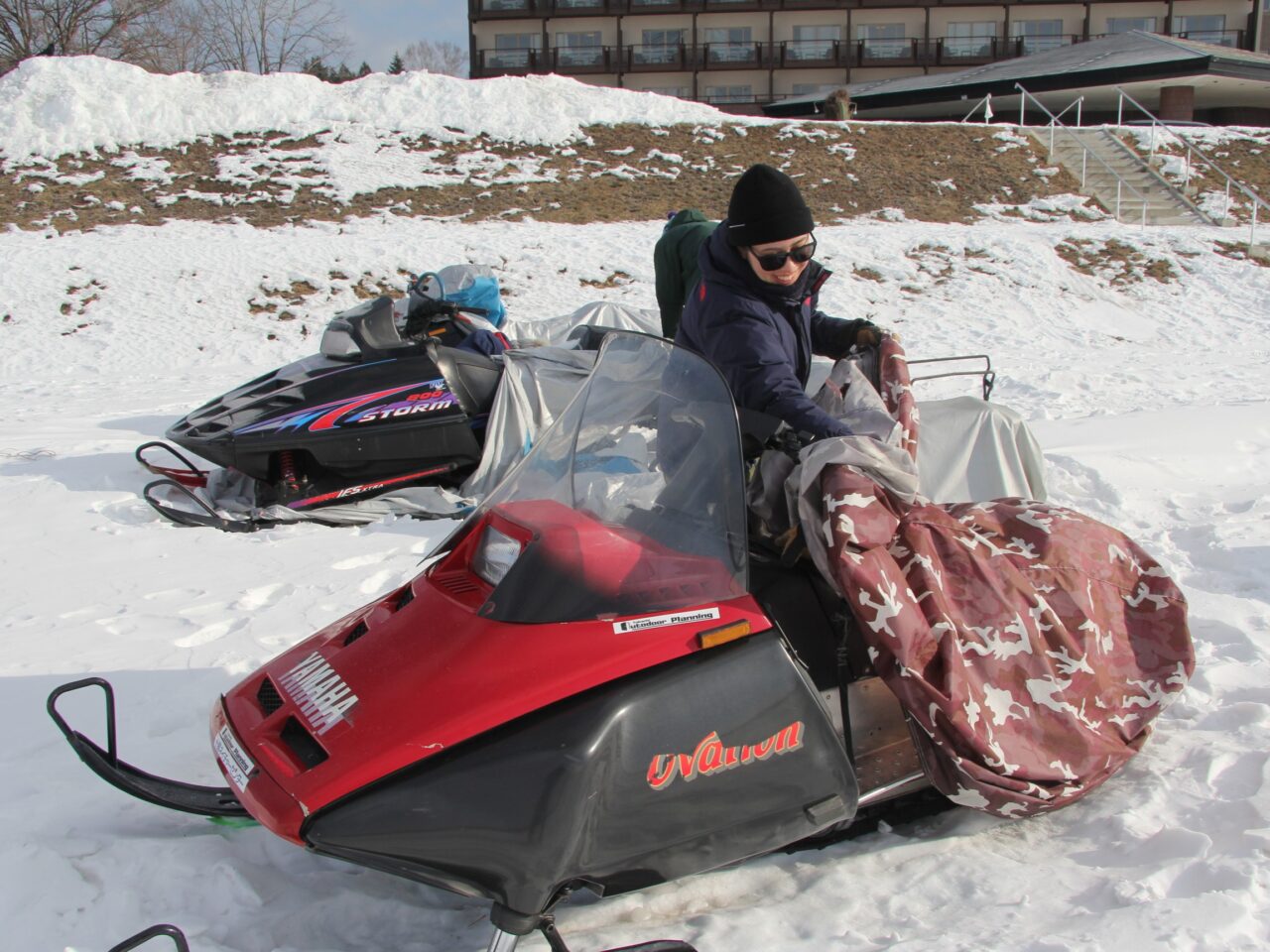 ツアーが終わった後は再びスノーモービルにカバーを被せて撤収です。