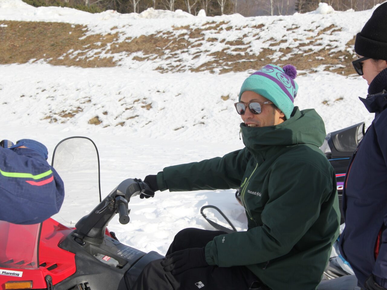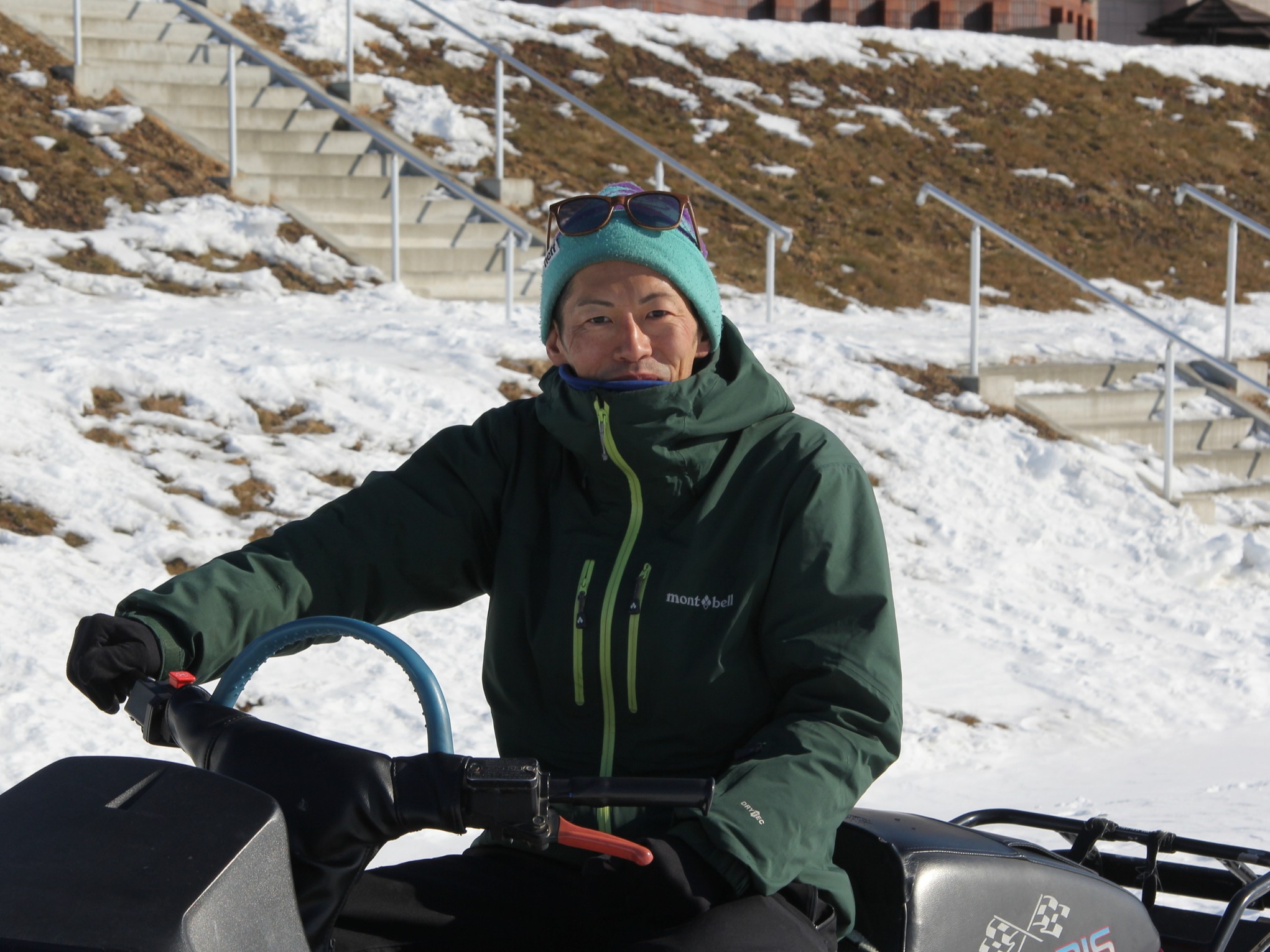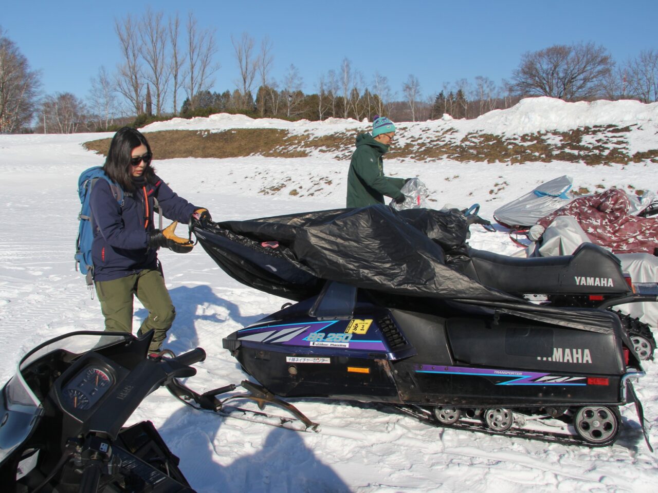 すでに設置してあるスノーモービルからカバーを取り外し、動作確認を行います。吉田さんも原田さんから動かし方をレクチャーしてもらい、試走していました。