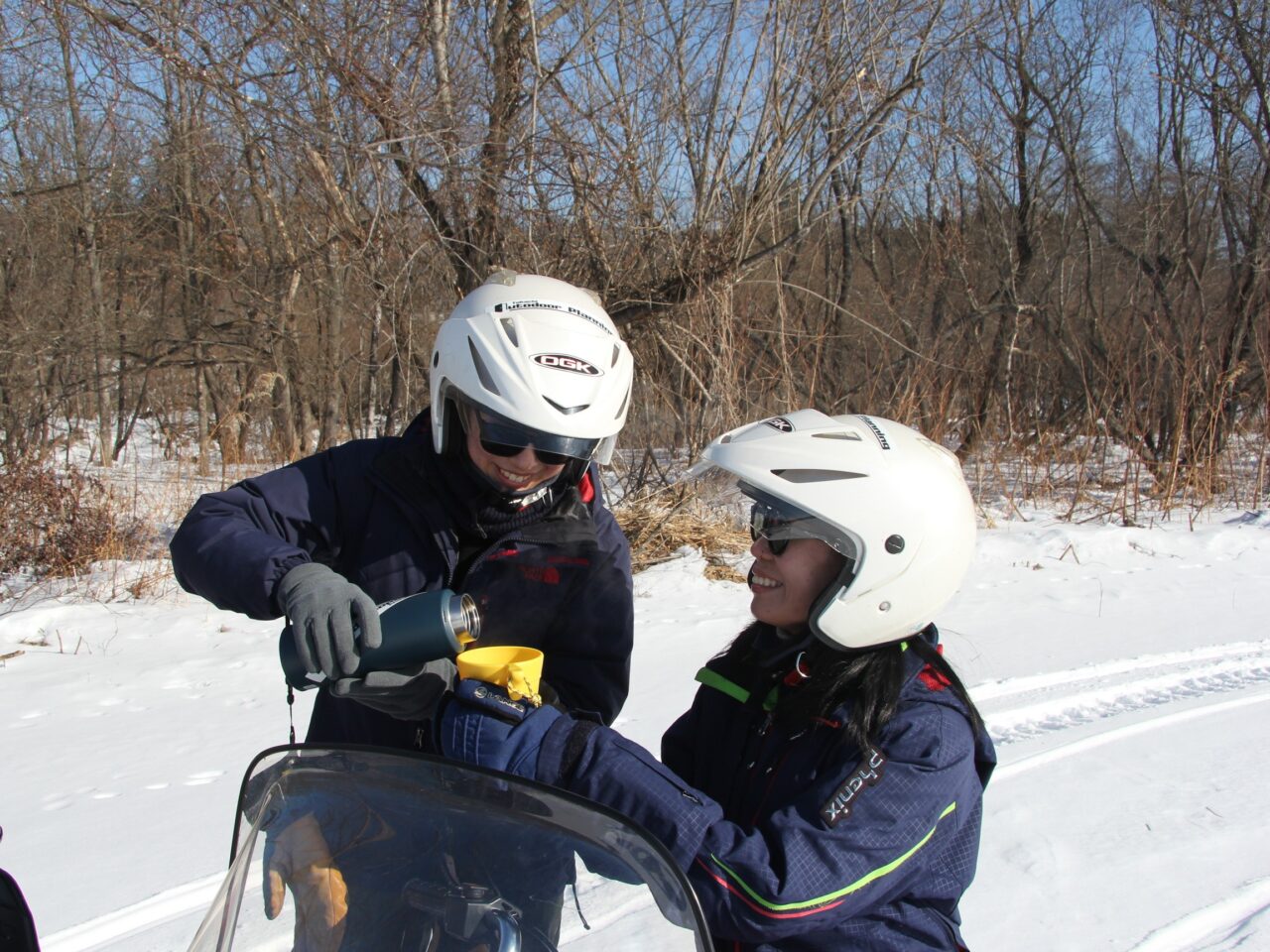 体験時間が半分を過ぎた頃、ガイドの原田さんが休憩にお茶を振る舞ってくれました。吉田さんも参加者に慎重にお茶を注ぎます。スノーモービルの上でのティータイムはなかなかレアな体験です。